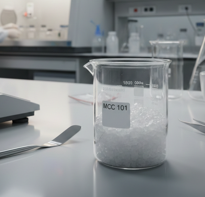 Microcrystalline Cellulose (MCC) is a high-purity pharmaceutical excipient derived from wood pulp. MCC 101 is the standard and most widely used grade globally as a Diluent (Filler) and Dry Binder in tablet and capsule manufacturing. It is characterized by very high compressibility and good flow properties, making it the preferred choice for the Direct Compression process, where it forms strong tablets at relatively low compression rates.