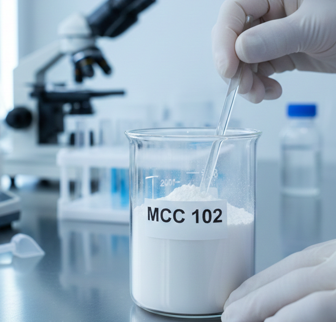 Microcrystalline Cellulose (MCC) is a high-purity pharmaceutical excipient derived from wood pulp. $\text{MCC 102}$ is the most common grade after $\text{MCC 101}$, primarily used as a Diluent (Filler) and Dry Binder in tablet and capsule manufacturing. It is characterized by a larger particle size (approx. 90-100 $\mu \text{m}$) compared to $\text{MCC 101}$, which provides Improved Flowability, making it ideal for the Direct Compression process, especially in high-speed production lines.